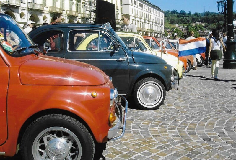 Na een heel korte rust gaan we weer. We worden onder politie begeleiding naar Piazza Vittorio Veneto in Turijn gebracht. Omdat de nieuwe Fiat 500 vanavond wordt gepresenteerd, staan vandaag de oudjes ter bezichtiging op het plein. En wordt 50 jaar Fiat 500 gevierd 1957 / 2007.